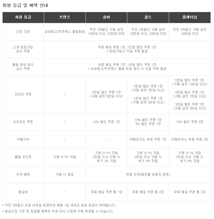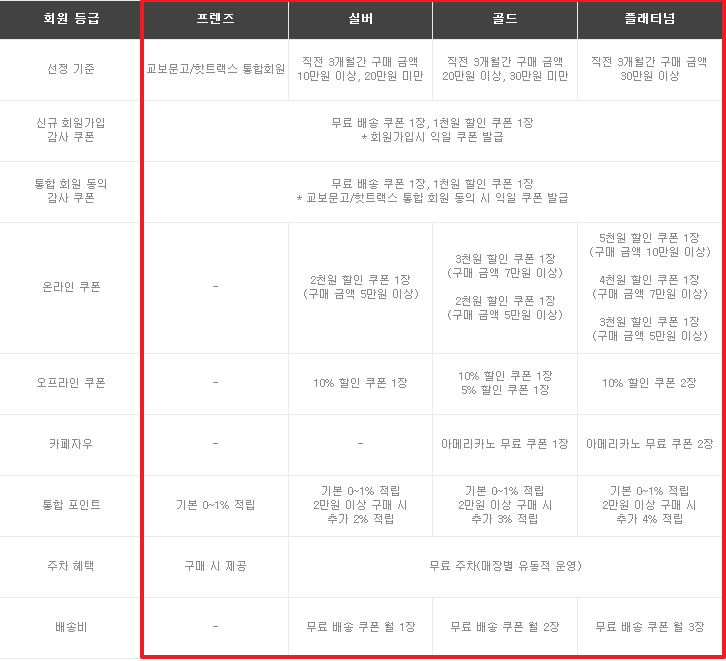 교보문고&핫트랙스 통합 멤버쉽 등급에는 프렌즈, 실버, 골드, 플래티넘 4가지가 있는데요, 신규 회원가입시 무료 배송 쿠폰 1장과 1천원 할인 쿠폰 1장을 감사 쿠폰으로 준다고 하네요 ^^ 마찬가지로 통합 회원 동의 시에도 동일한 쿠폰이 발급된다는 점! 아직 교보문고 통합 멤버쉽 가입하지 않으신 분들은 이참에 회원 가입하시는 것도 좋을것 같습니다.