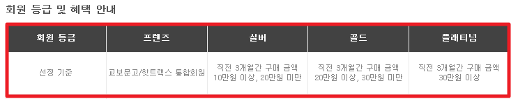 교보문고 통합회원 가입만 하시면 자동으로 프렌즈 등급이 됩니다. 실버 등급 부터는 구매 금액에 따라 정해지는데요, 직전 3개월간 이용 내역을 반영하여 매월 1일 새로운 회원 등급이 부여된다고 합니다. 실버는 직전 3개월간 구매 금액 10만원 이상 20만원 미만, 골드는 20만원 이상 30만원 미만, 플래티넘은 30만원 이상이 선정 기준입니다.