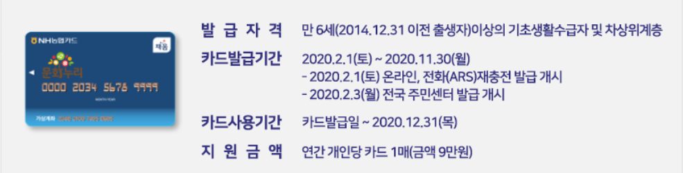 문화누리카드는 삶의 질 향상과 문화격차 완화를 위해 기초생활수급자, 차상위계층을 대상으로 문화예술, 국내여행, 체육활동을 지원하는 카드입니다. 매년 지원비도 점차 증가하고 있는데요, 2018년 1인당 연간 7만원 지원 -> 2019년 1인당 연간 8만원 지원 -> 2020 1인당 연간 9만원 지원으로 올해는 9만원이 지원됩니다.