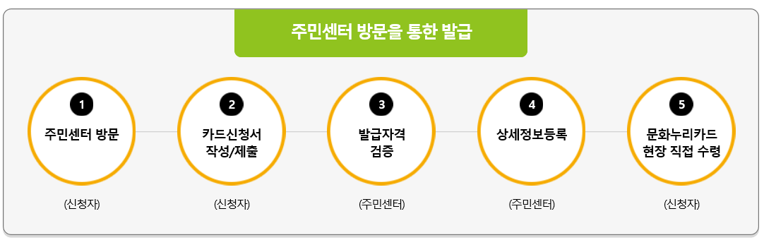 지난 2월 1일부터 문화누리카드 발급 이 시작되었는데요, 신규 발급을 원하실 때는 주민센터 방문 혹은 인터넷 누리집 접속을 통해 발급하실 수 있습니다. 먼저 주민센터를 방문하는 방법부터 사진으로 살펴보실까요?