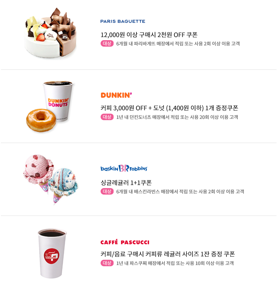 또한, 해피포인트 회원에게는 파리바게뜨, 베스킨라빈스, 던킨도너츠, 파스쿠찌에서 생일 쿠폰을 증정한다고 합니다. 생일까지 챙겨주는 해피포인트 적립 안 할 이유가 없겠죠?