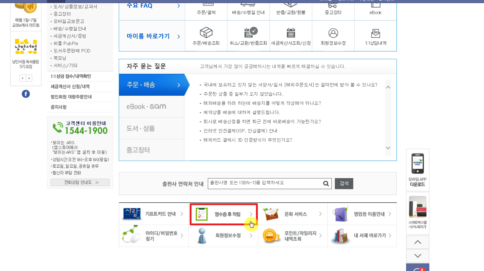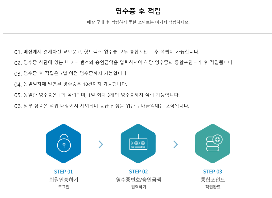 마지막으로 계산할때 깜빡하고 포인트 적립을 안했을 경우를 대비하여 교보문고 통합포인트는 '구매 후 적립'이 가능한데요, 구매 후 적립 방법을 알려드리겠습니다.