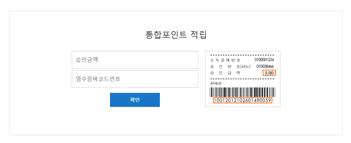 구매하신 영수증 바코드번호와 승인금액을 입력하시고 확인 버튼을 누르시면 후 적립이 완료됩니다.