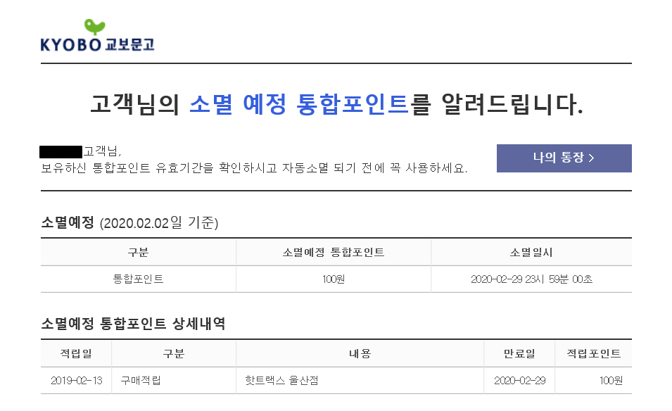 바로 소멸 예정 교보문고 통합포인트 알림 메일입니다. 제가 사는 지역 중심가에 교보문고 핫트랙스가 있어서 가끔 구경하러 갔다가 필요한 것들을 (이라고 쓰고 마음에 드는 것들이라고 말합니다..) 종종 구입하는 경우가 있거든요. 한창 핫트랙스를 많이 방문하던 시절에 교보문고 멤버십 등록을 해놓았더니 통합포인트 소멸 알림 메일도 오는군요.